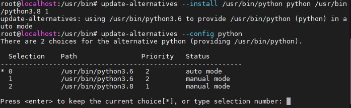 root@localhost:/usr/bin# update-alternatives --install /usr/bin/python python /usr/bin/python3.8 1