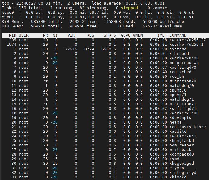 KiB Mem : 985340 total, 263592 free, 158480 used, 563268 buff/cache