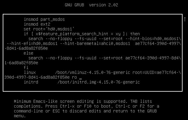 이 화면에서 아래로 좀 더 내려보시면, 아래와 같은 화면을 찾을 수 있습니다. 지금 커서가 놓인 위치를 보시면 됩니다. ro라고 쓰인 뒤에 한 칸 띄우고 위치해 있습니다. 확인되시나요? linux로 시작하는 라인 맨 끝줄, initrd로 시작하는 라인 윗줄입니다.
