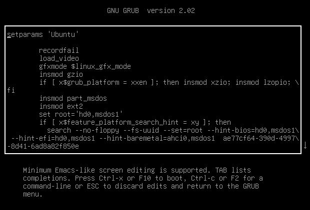 그러면 화면이 edit the commands before booting으로 진입하게 됩니다. 부팅 전 커맨드 편집 정도 되겠습니다. 아래와 같이 화면이 출력됩니다.
